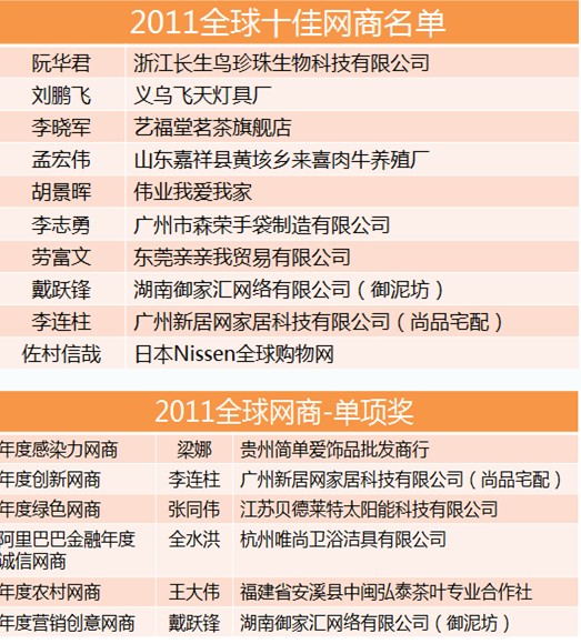 2011全球十佳網(wǎng)商及各單項(xiàng)名單